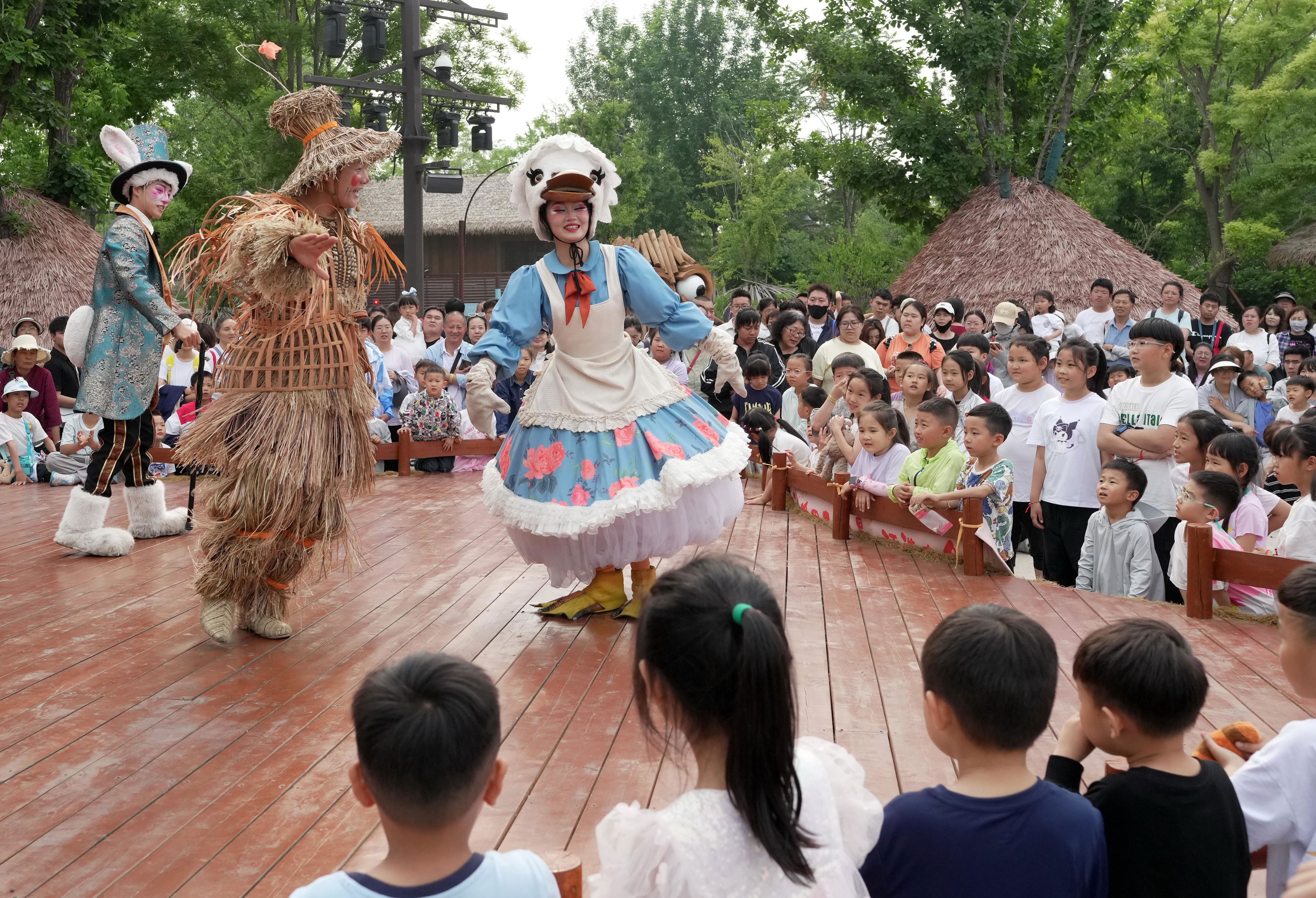 5月31日,秦皇岛市北戴河新区渔田七里海度假区的演员在为游客表演节目《稻草人和他的朋友们》。 新华社记者 杨世尧摄
