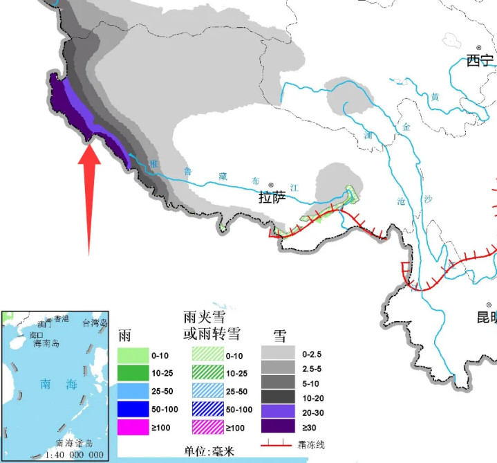 从雨雪的发展情况来看,南方大部区域都只有0到10毫米的阴雨覆盖圈了,只有云南少部分地带是10毫米到25毫米区间,而西部方向还是主要的雨雪中心,其西藏等区域依然有大雪出现。
